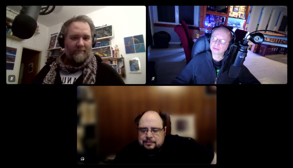 Frank ist in Personal-Union Autor, Regisseur, Produzent, Tontechniker und Sprecher der Emiten, und Tanja erfüllt, neben ihrer Sprecher-Rolle als eine der wichtigsten Hauptfiguren in der Geschichte, auch einen sehr wichtigen Part in der Produktion: sie hat die unverzichtbare Aufgabe der Drehbuch-Lektorin übernommen. Beide plaudern aus dem Nähkästchen, was es bedeutet, so ein Hörspiel-Projekt zu betreiben, im Großen, wie auch im Detail. Frank erzählt von der Idee und der Entstehung des Hörspiels, er schildert, wie man einen Ort akustisch erschafft, wie komplex so ein Sound-Bild sein muss, das man da “malt”. Wir erfahren von Frank und Tanja, welche Herausforderungen es bringt, eine Geschichte zu entwickeln, und welche, sie zu lektorieren, und auch Felo kann von seinen Erfahrungen als Sprecher von Neben- und Hauptrollen erzählen. Wir hören Anekdoten von den Aufnahmen, erfahren was über das etwas andere Konzept des Erstkontakt, reden über die Herausforderung der richtigen Schritte…